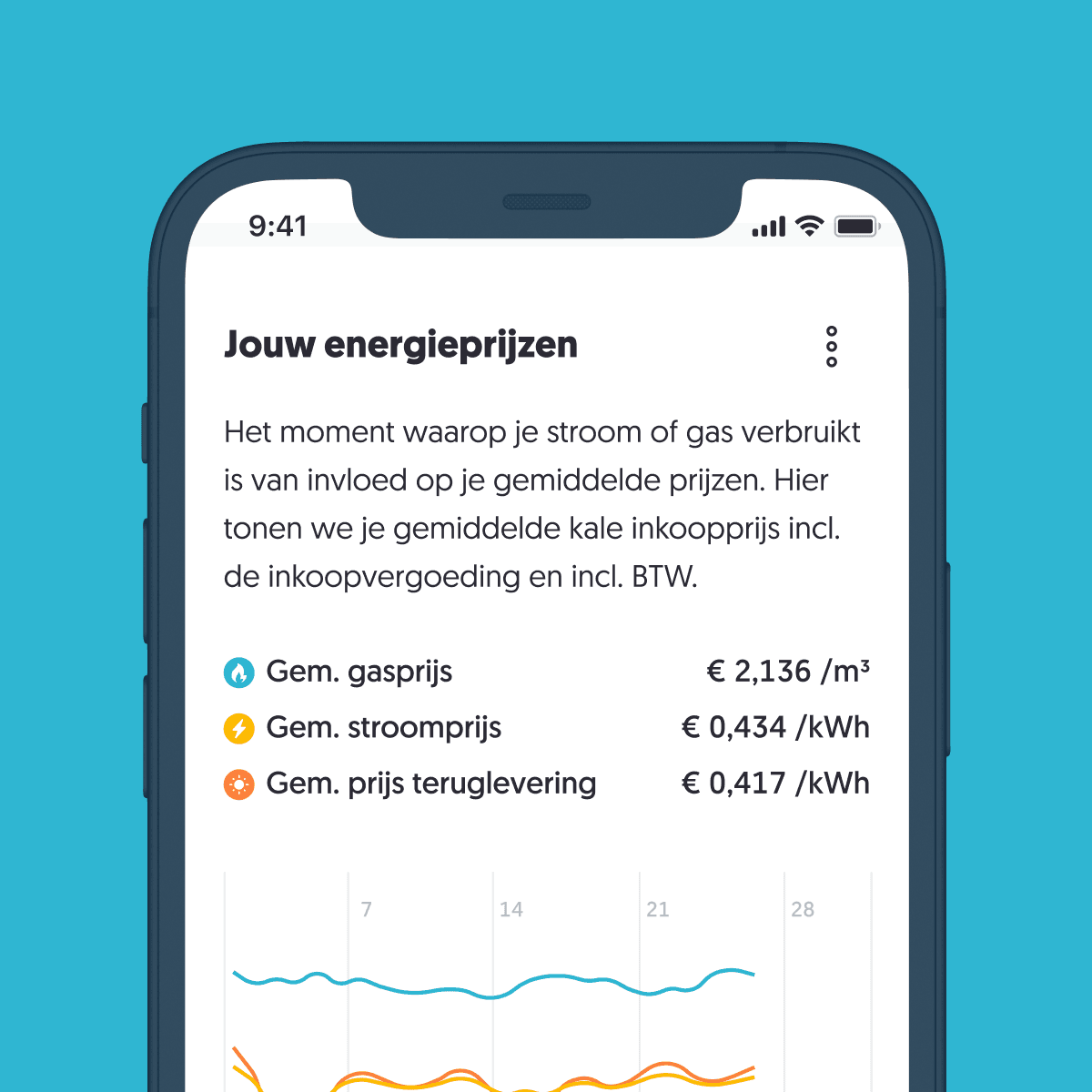 Hieronder tref je de door jou gerealiseerde gemiddelde prijs voor gas en stroom (en als je zonnepanelen hebt, ook voor teruglevering). Omdat de energieprijzen dynamisch zijn kan je door het moment waarop je verbruikt, je gemiddelde prijs beïnvloeden. Verschuif je naar goedkopere momenten op een dag, dan daalt je gemiddelde prijs. Verbruik je op dure momenten, dan pakt de gemiddelde prijs hoger uit.