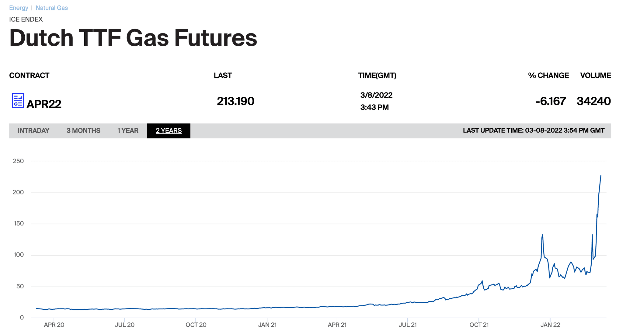Gasprijzen op de groothandelsmarkt stegen de afgelopen dagen naar een historisch hoogtepunt. Gisteren (7 maart) tikte de future prijs voor april 345 EUR/MWh (3,37 EUR/kuub) aan, om aan het einde van de dag te sluiten op 227 EUR/MWh (2,22 EUR/kuub). De stroomprijs steeg mee en eindigde op 484 EUR/MWh (0,48 EUR/kWh).