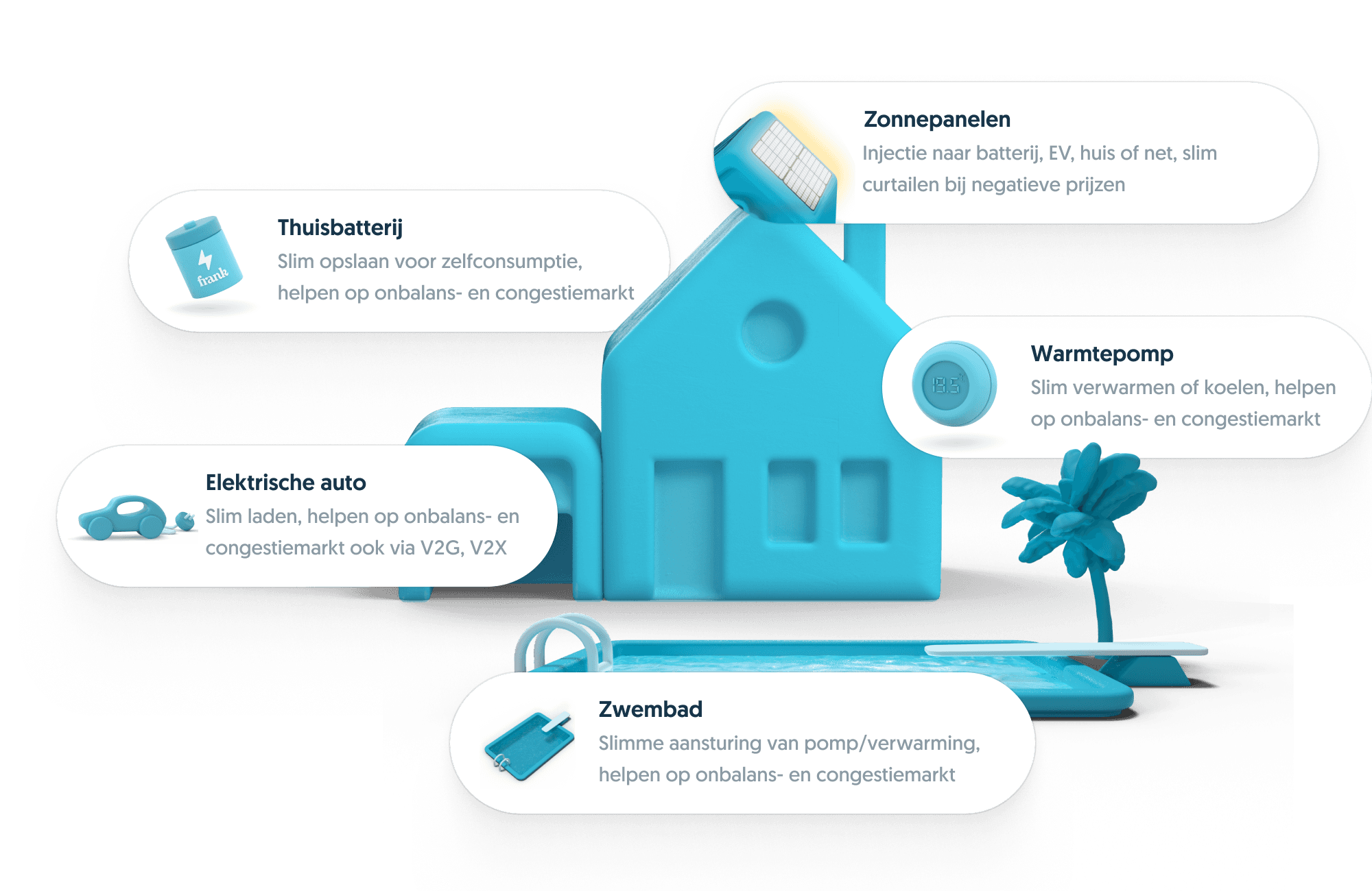 Nederland heeft 3 miljoen huishoudens met zonnepanelen (de hoogste penetratie ter wereld). We hebben een half miljoen elektrische auto’s rondrijden en er zijn zo’n half miljoen warmtepompen en/of elektrische boilers geïnstalleerd. Met thuisbatterijen zijn we net gestart (nu zo’n 25.000) en die markt groeit snel.